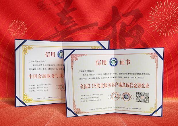 2019-2025年,汉声集团连续六年荣膺由中国质量检验协会颁发的“全国3.15质量服务客户满意诚信金融企业”和“中国金融服务行业AAA级信用企业”两项荣誉。