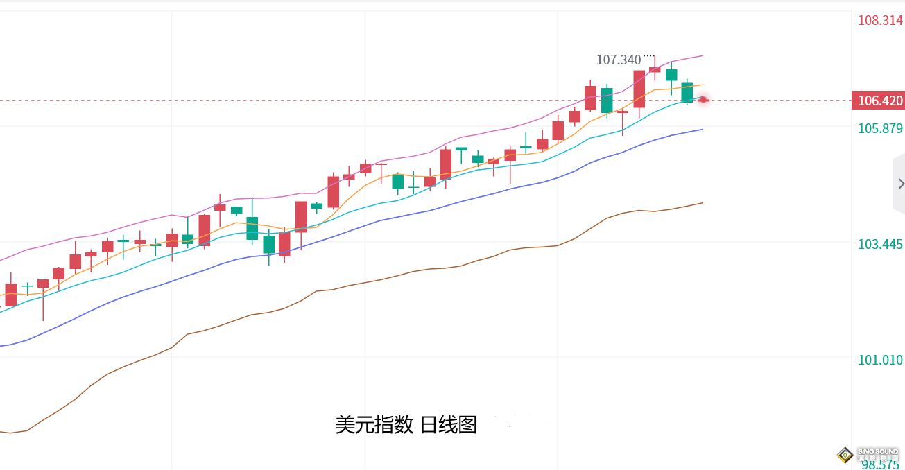 整體來看,美元指數日圖仍保持的反彈趨勢中,短線的走弱對金價支撐有限,周圖已走出11連陽,本周目前仍維持強勢,有望走出12連陽的趨勢,但如本周收取倒垂陰線,則後市有面臨連續回調修正的行情,但根據月圖來看,看漲攀升的空間仍然很大,中軌線支撐也是很好的再度看漲入場節點,因而,就算有回調,空間也是有限的。