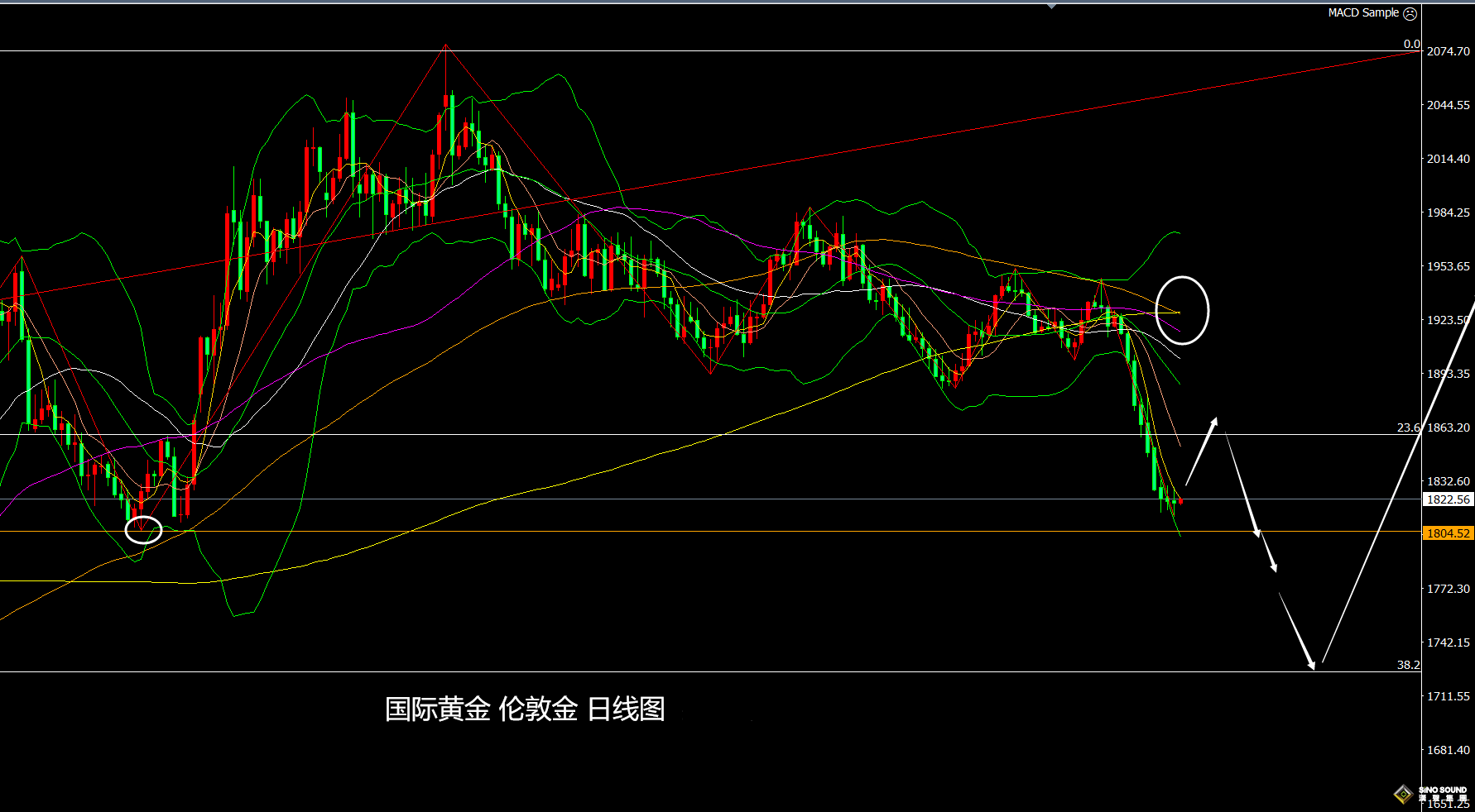 所以,對於金價來說,目前的震盪築底,就算有回升反彈行情,上方100周均線阻力,或者是日圖23.6%回撤線的1860美元附近,也都是可再度看跌回落的位置。