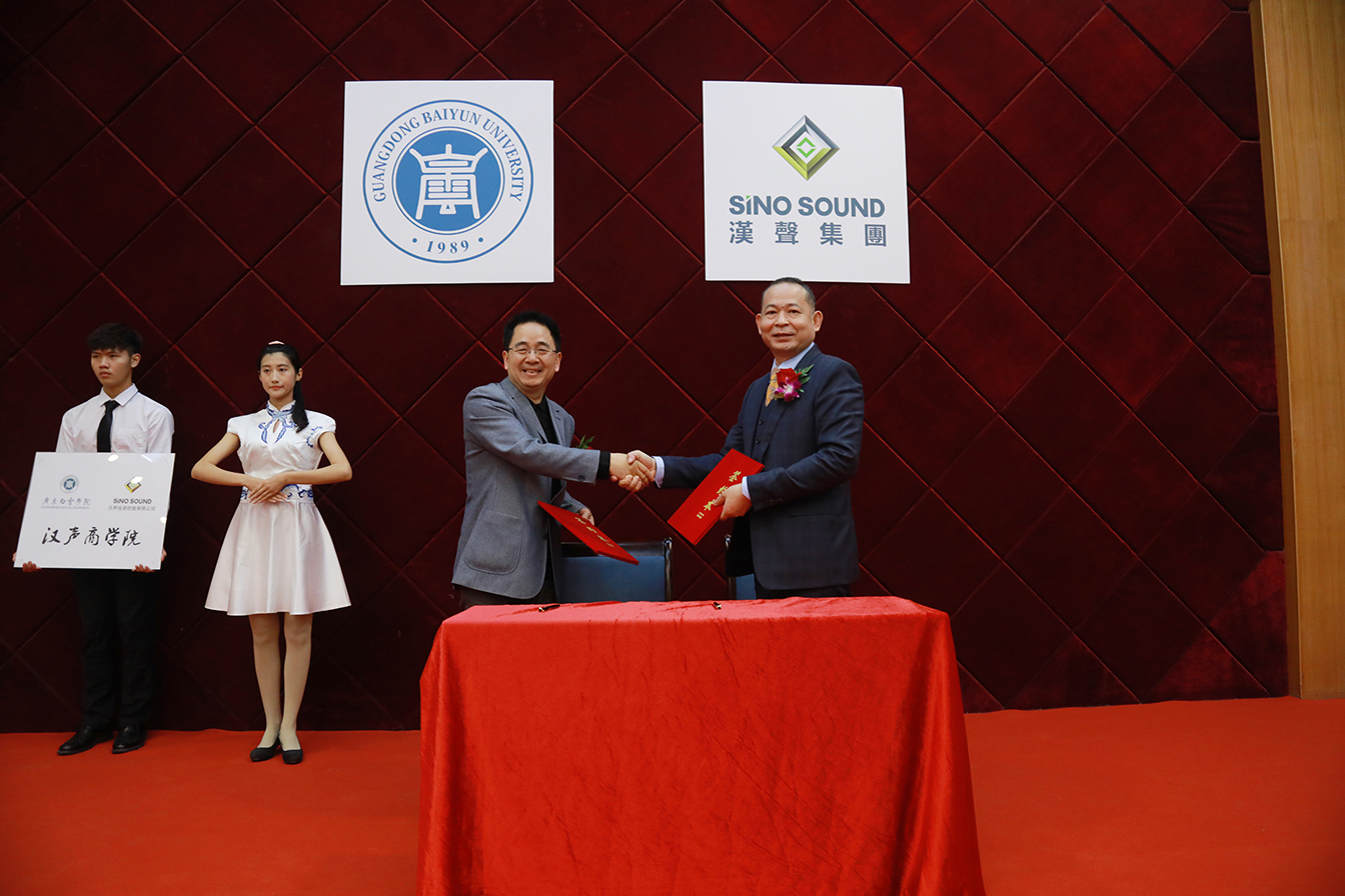 廣東白云學院應用經濟學院院長吳鐵雄先生(左)與香港漢聲集團首席執行官張立仁先生(右)進行現場簽約