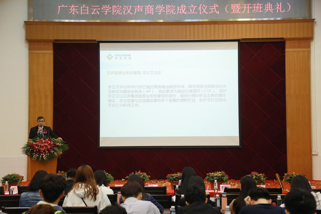 慶典圓滿結束后,漢聲商學院開始了首次授課。首先由李正文先生就漢聲集團如何為廣東白云學院注入國際金融理財的先進思想,給在座學員開啟財富之門。然后,莊興先生也從金融從業者的視角,分享了自己在金融實踐經驗方面的獨到見解。他們希望學員們通過漢聲商學院這個平台上,收獲知識,學有所成。現場座無虛席,學員們都把握這個難得的機會,認真聽課并做好筆記。